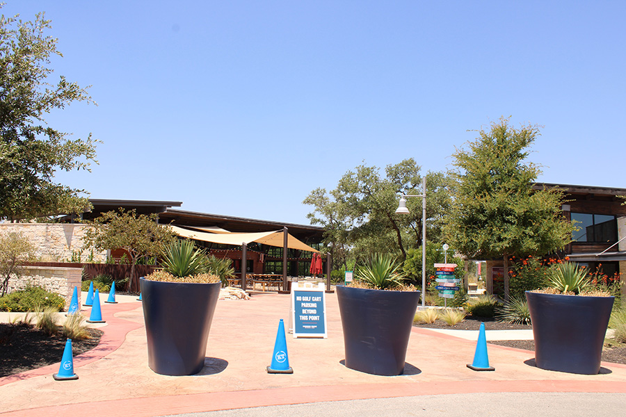 To ensure people can safely enter and exit KT buildings, golf cart parking is strictly prohibited within the Biergarten and on sidewalks by the Welcome Center. Residents may not pass the blue potted plant holders or blue cones unless they have prior approval from a Community Life staff member. Please use The Mix’s main parking lot in front of Independence Hall.